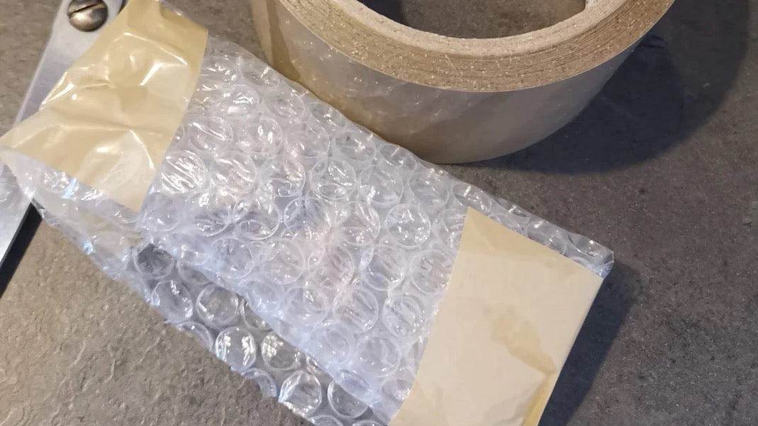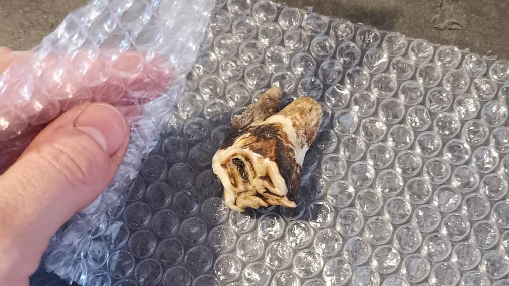 Wickle deinen Pferdezahn gut in ein Stück Luftpolsterfolie oder in etwas Zewa (Küchenrollenpapier) ein und klebe ihn gut zu, damit der Zahn nicht rausrutschen kann.