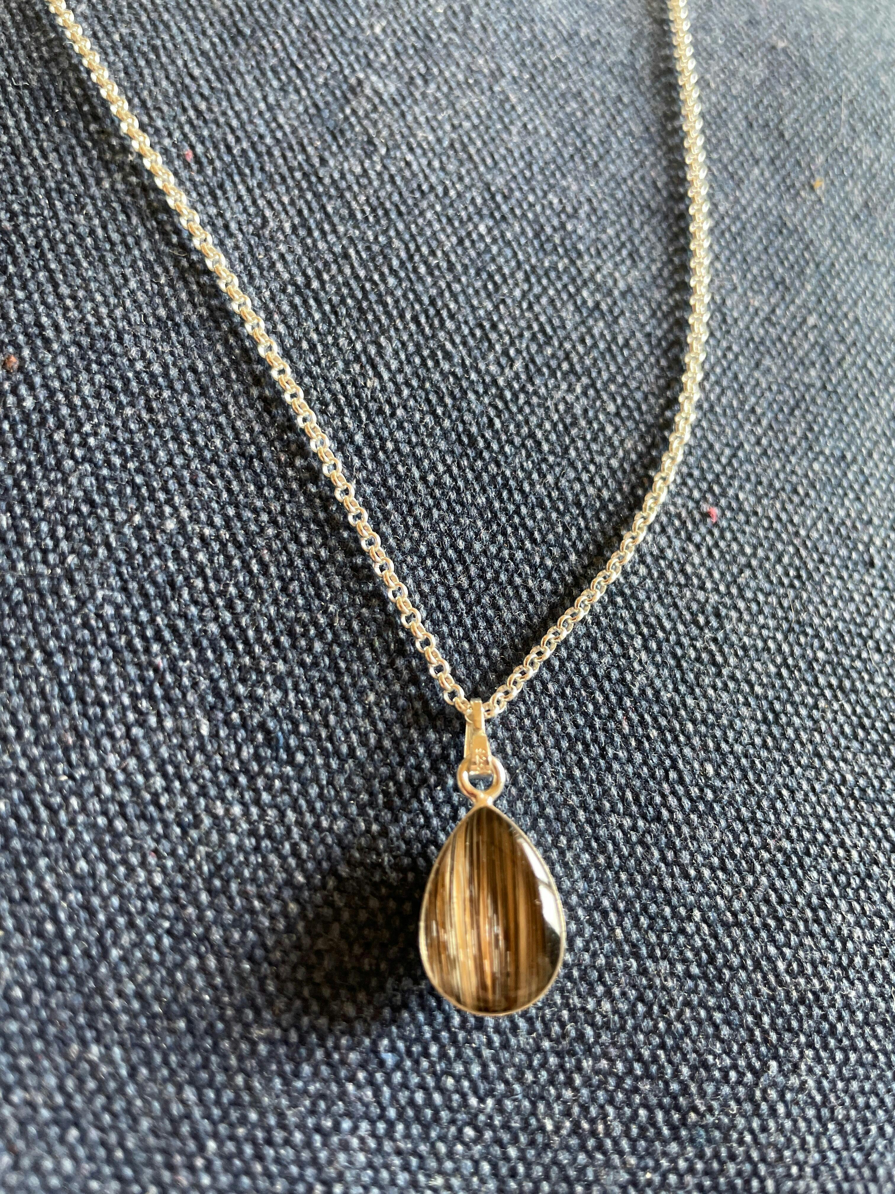 Kette Andaluz ist ein einzigartiges und faszinierendes Stück. Sie besteht aus einem glänzenden Metallrahmen, in der Form eines Tropfens. Der Rahmen ist filigran und elegant gestaltet, um die Schönheit der eingearbeiteten Haare zu betonen.